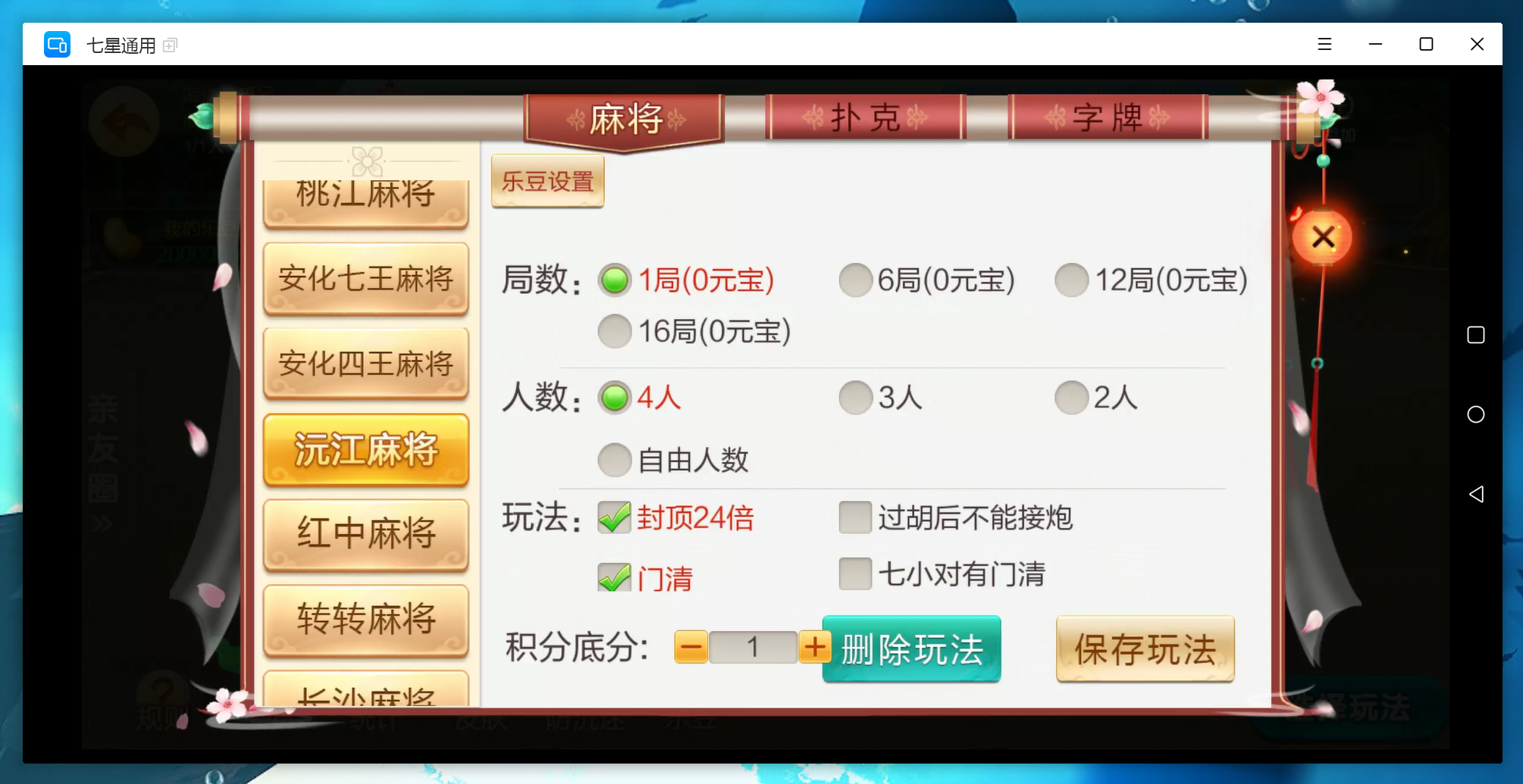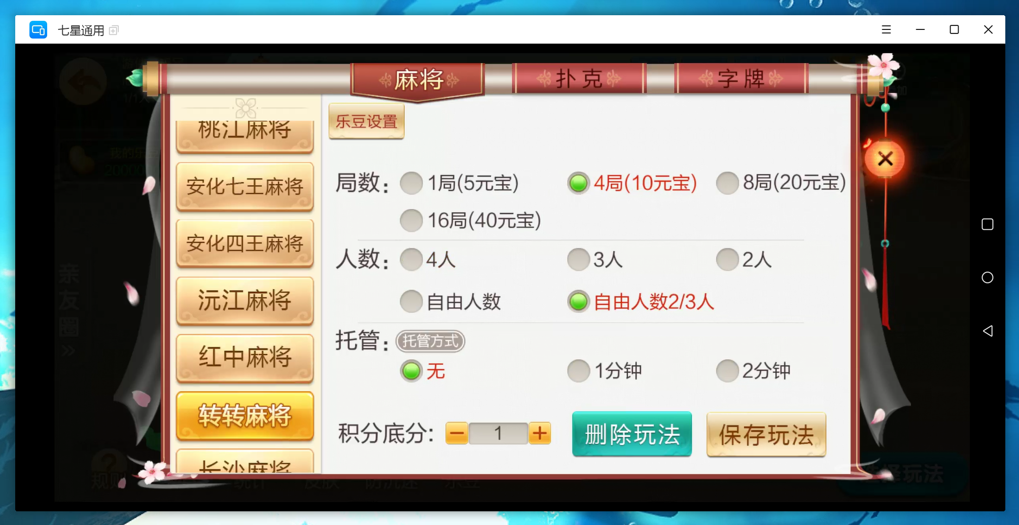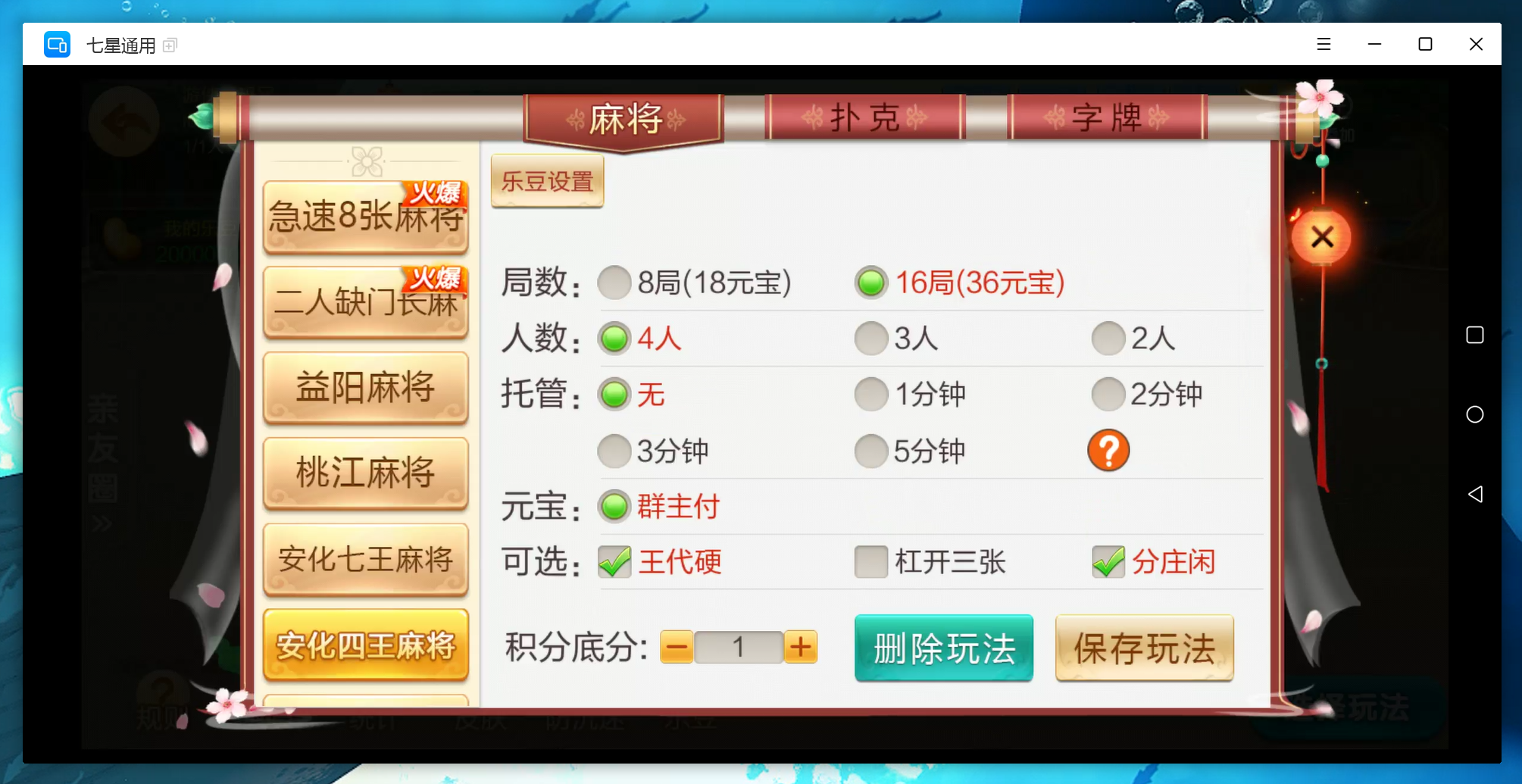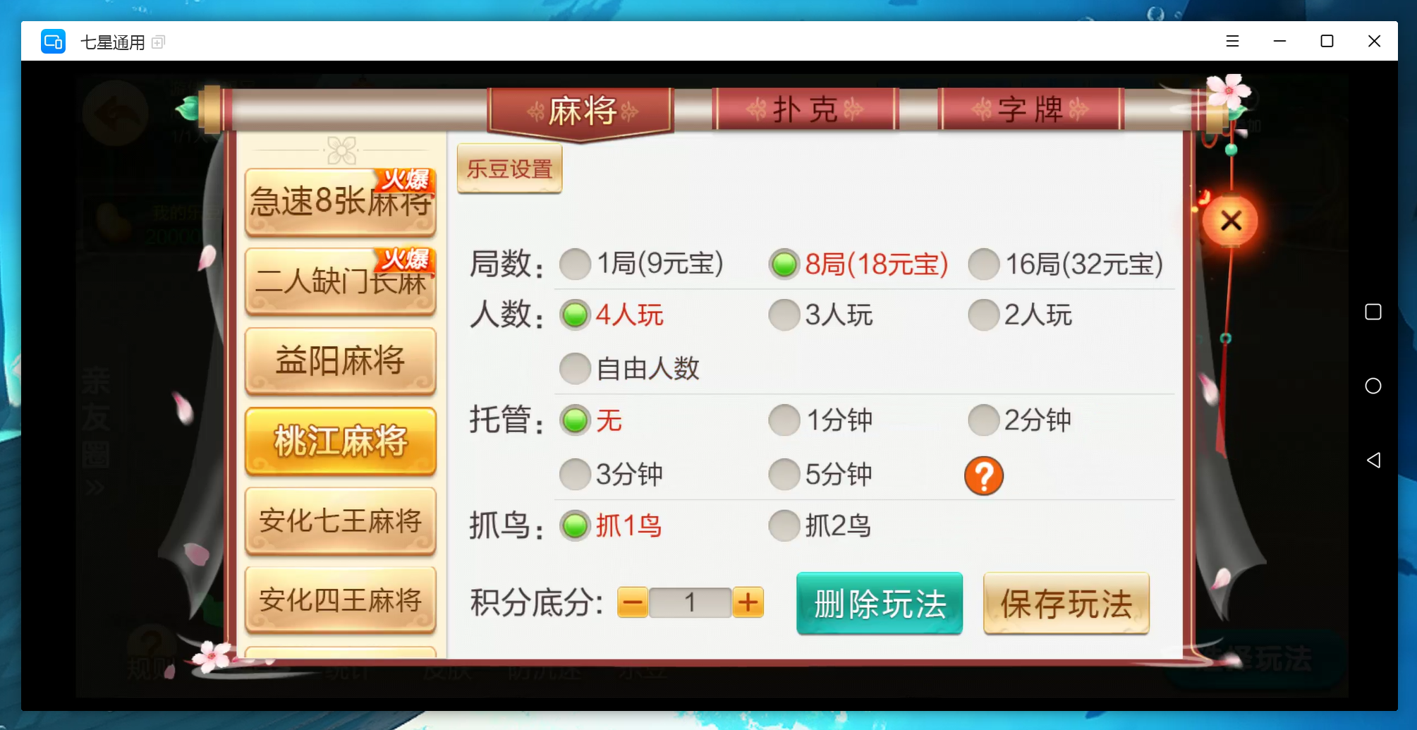 麻将:急速8张麻将,二人缺门长麻,益阳麻将,桃江麻将,安化四王麻将,安化七王麻将,红中麻将,沅江麻将,长沙麻将,转转麻将