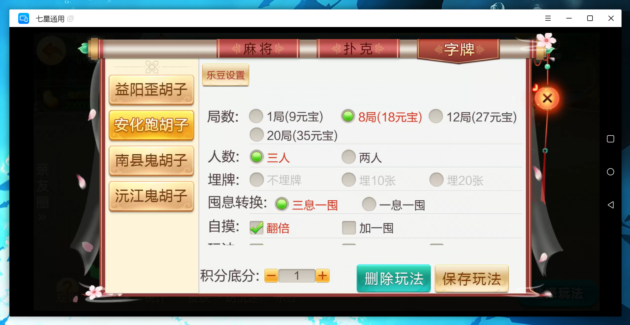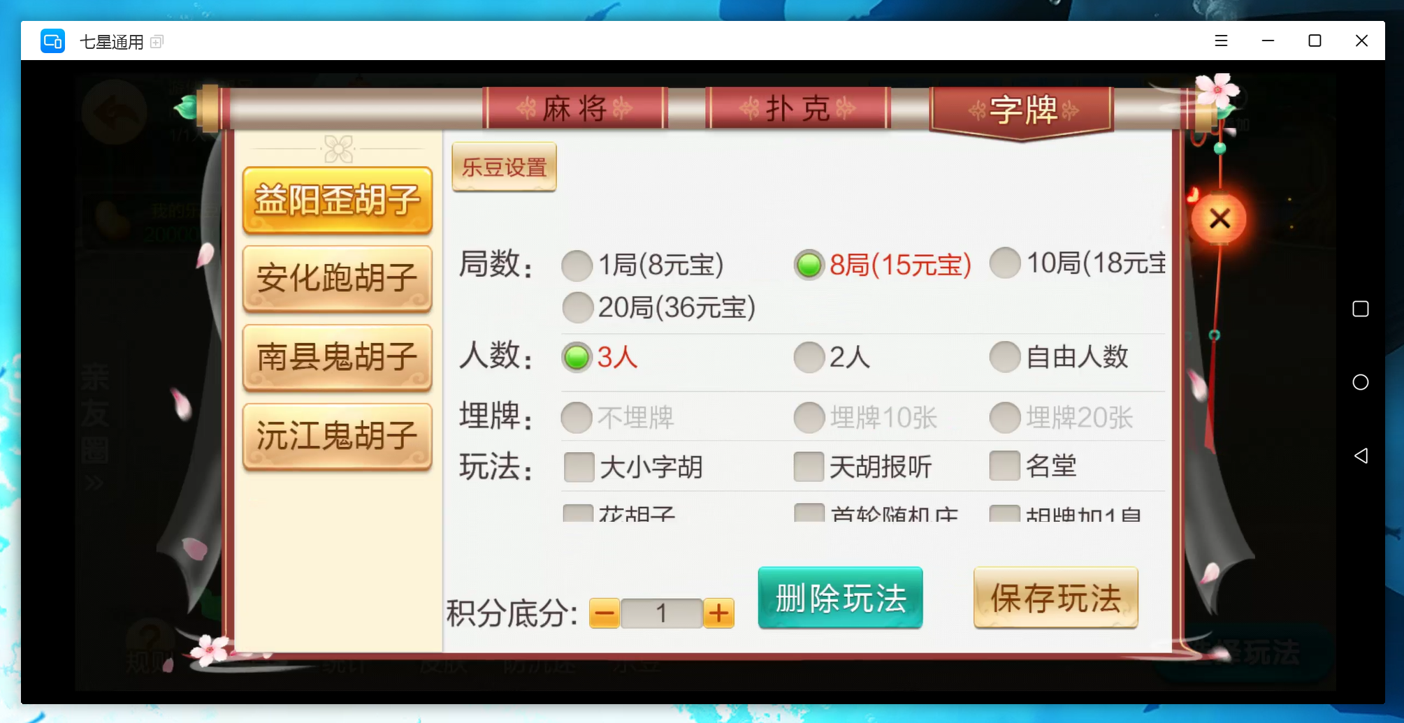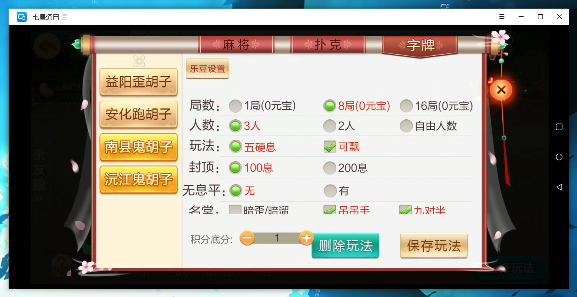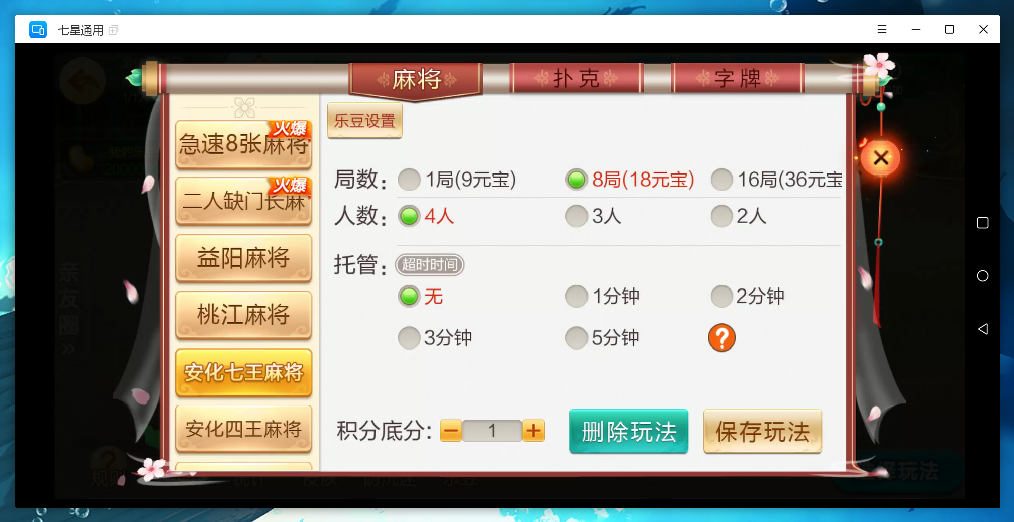 麻将:急速8张麻将,二人缺门长麻,益阳麻将,桃江麻将,安化四王麻将,安化七王麻将,红中麻将,沅江麻将,长沙麻将,转转麻将