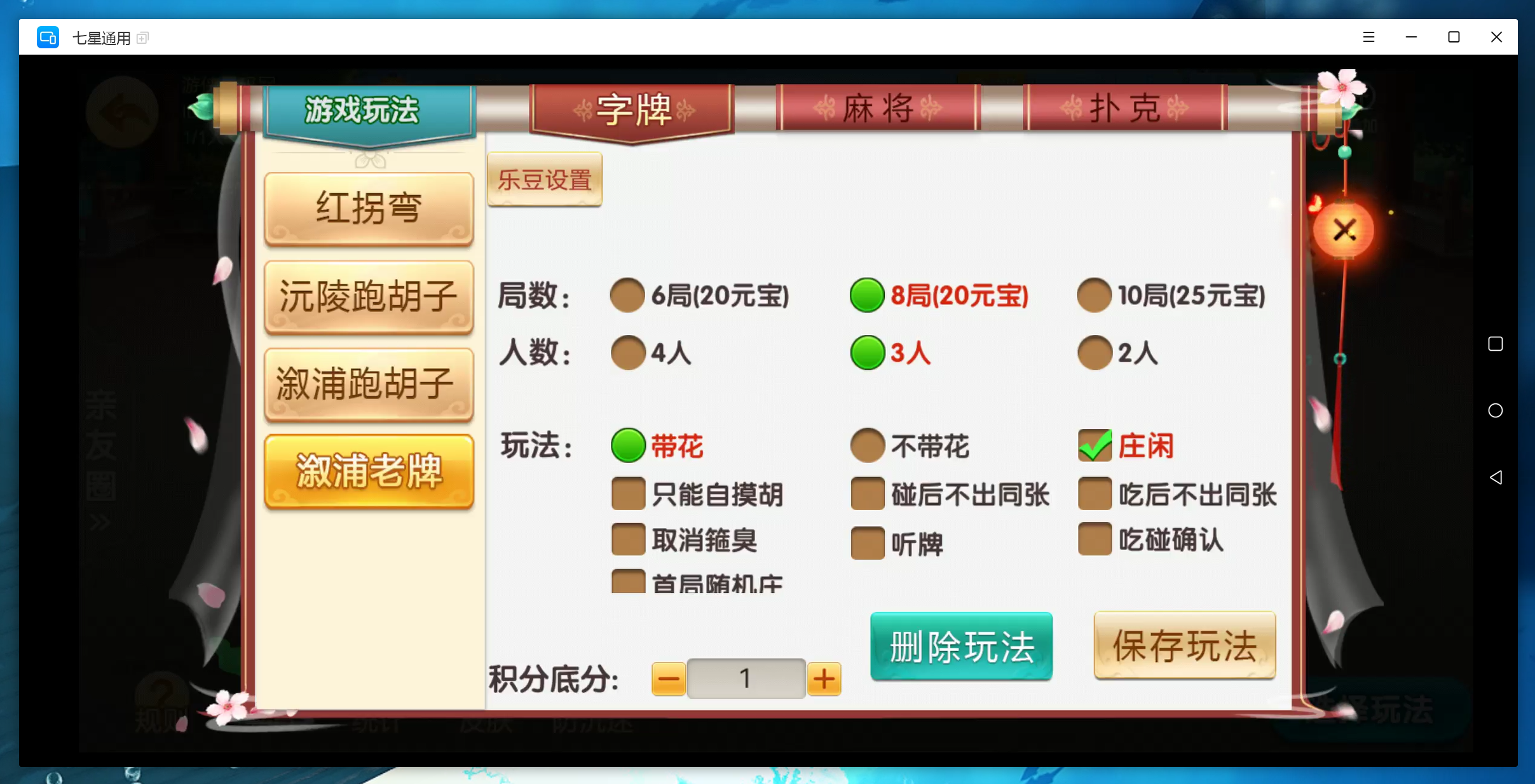 字牌:红拐弯,江陵跑胡子,溆浦老牌,溆浦跑胡子