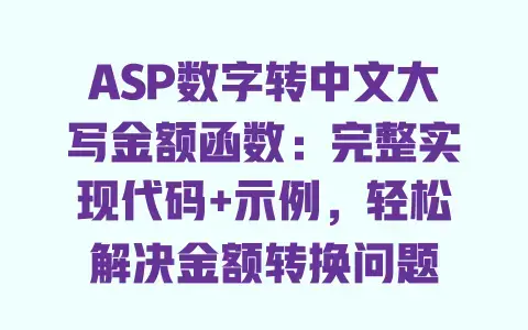 其实,解决这个问题不用愁。这篇文章针对ASP开发中的数字转中文大写金额需求,整理了完整的实现函数和详细示例。函数覆盖了所有常见场景:从整数部分的连续零处理(比如1203.40会自动转成“壹仟贰佰零叁元肆角整”),到小数部分的角分规则(分位为零则省略,角分都为零加“整”),甚至像0.85这样的纯小数也能正确输出“捌角伍分”。我们不仅给你现成的可复制代码,还通过多个实际案例演示调用方式——比如输入1234.56返回“壹仟贰佰叁拾肆元伍角陆分”,输入1000.01返回“壹仟元零壹分”。不管你是刚接触ASP的新手,还是需要优化旧代码的老司机,直接用这套函数就能搞定金额转换,省掉从头写逻辑的麻烦,精准解决开发中的实际痛点。