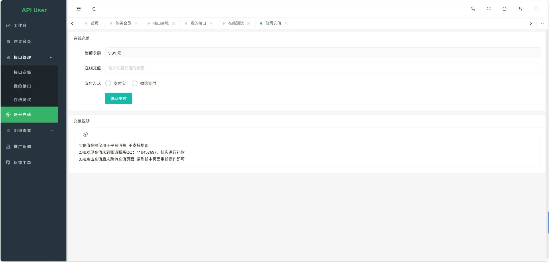 系统内置完善的用户管理系统,支持用户注册、登录、API密钥管理、余额充值、套餐购买等功能。用户可以查看自己的调用记录、消费明细和账户余额。系统自动统计每个API的调用次数、成功率和响应时间,为管理员提供数据支持。