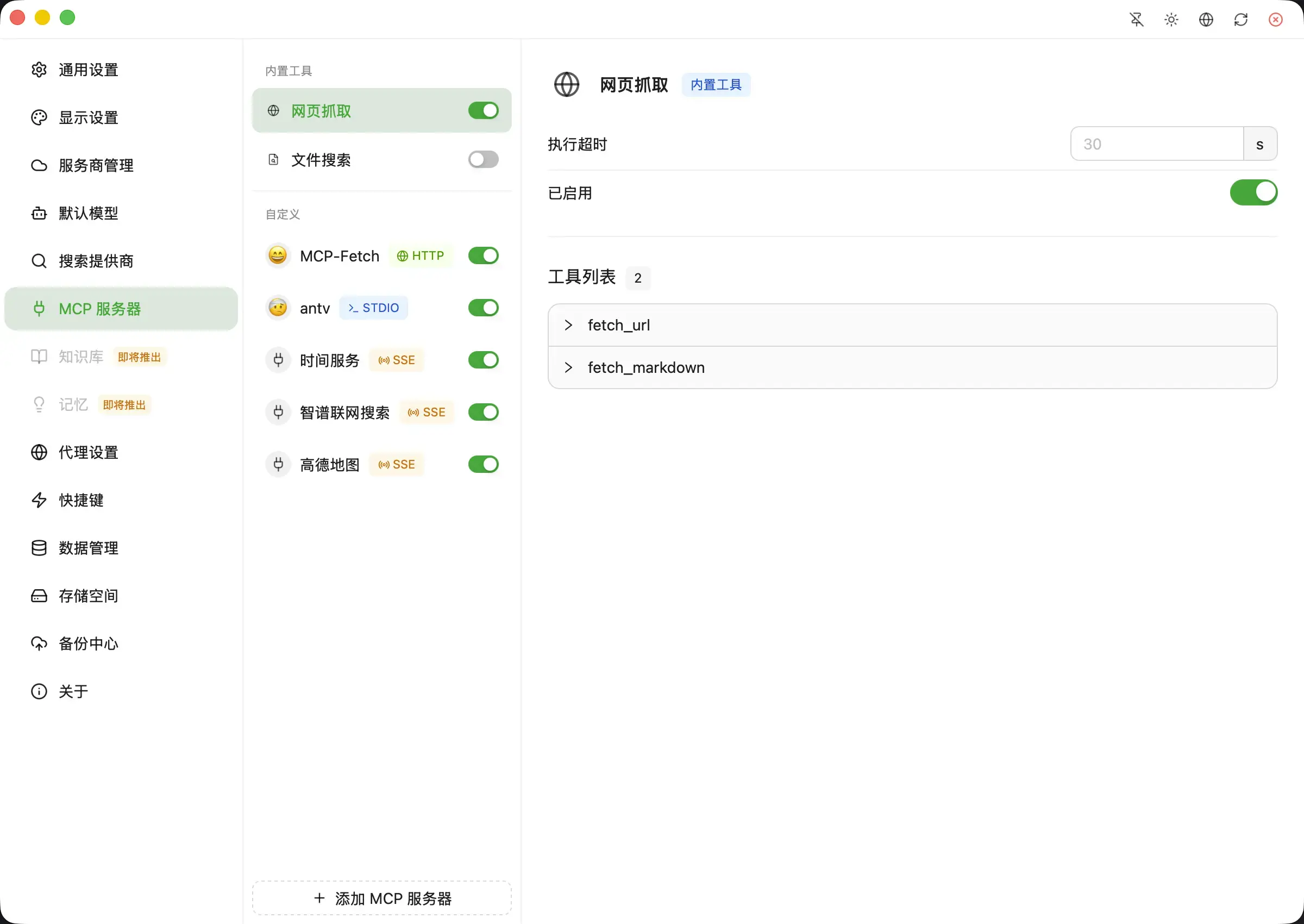 • 内置工具— 提供@aqbot/fetch等开箱即用的内置MCP工具