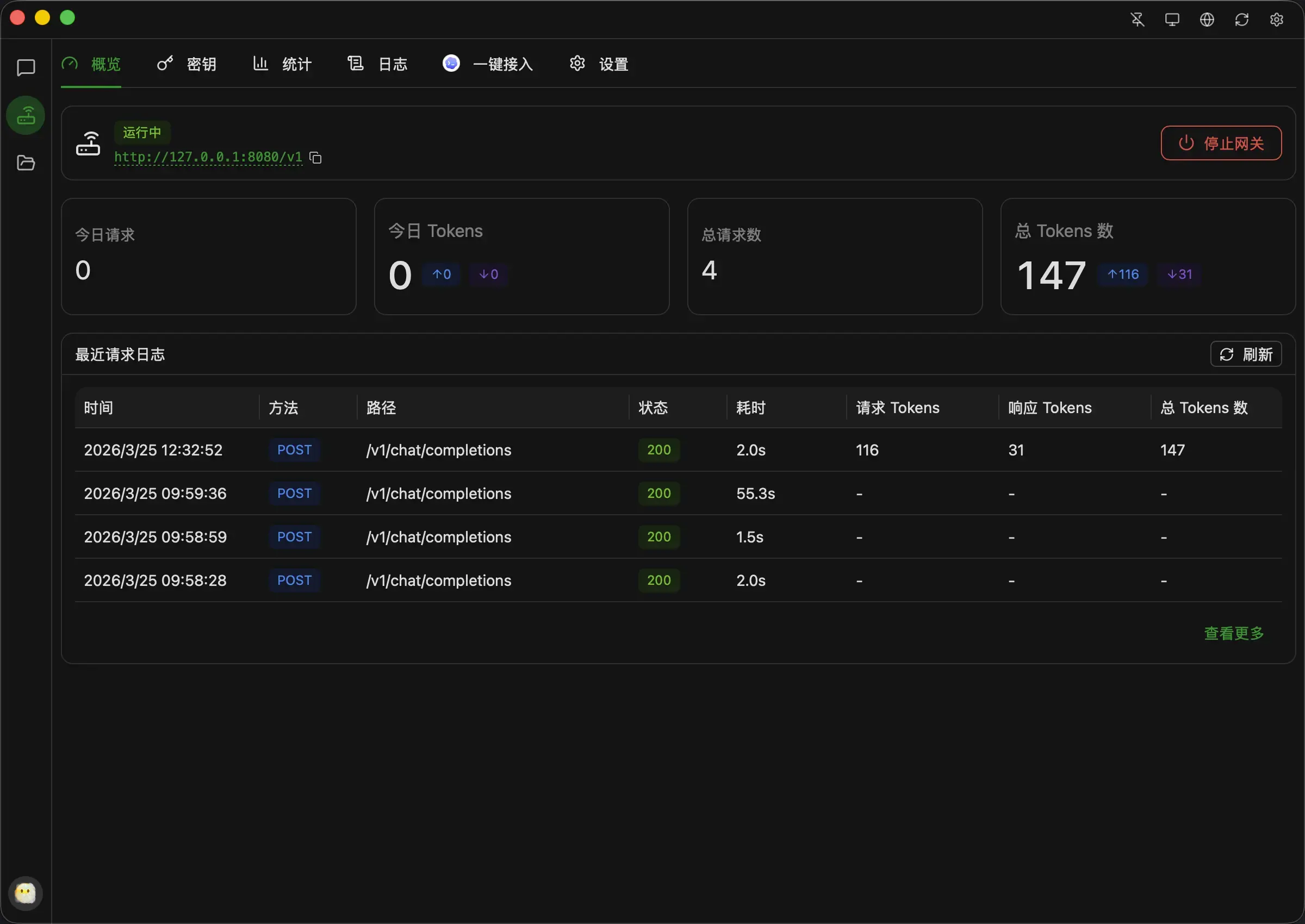 • 用量统计— 按密钥、供应商、日期维度的请求量与 Token 用量分析