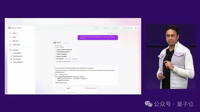 然后Amazon Quick就能秒懂项目是什么、理解同事之间的关系、自动检查日历和时区、发出会议邀请,再顺手发Slack(类似钉钉)消息通知。