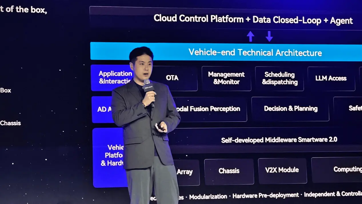 云端AI 原生大脑 Brain2.0构建多智能体协同架构,搭配云控基础平台、数据闭环、AI 智能体监控中心、手机 APP 全链路管理系统,实现多车型、多场景、多机器人协同作业,打通 “端到端无人配送” 全流程。