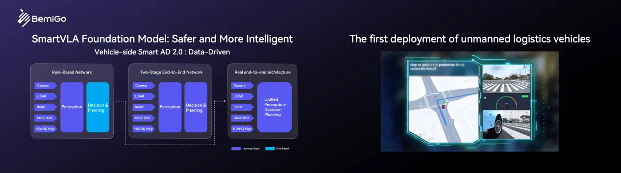 依托Smartware2.0 自研中间件,斑陌易行打造乐高式模块化软硬件架构,统一接口、预埋硬件、按需组合,实现开箱即用、快速部署、易扩展、易维护,真正做到 “即刻落地”。基于 NVIDIA Alpamayo 1.5 开源基座构建的SmartVLA 大模型,在 Jetson Thor 平台首次完成无人物流车上的部署,让车辆具备真实场景理解与自主决策能力,实现更安全、更智能的自动驾驶。